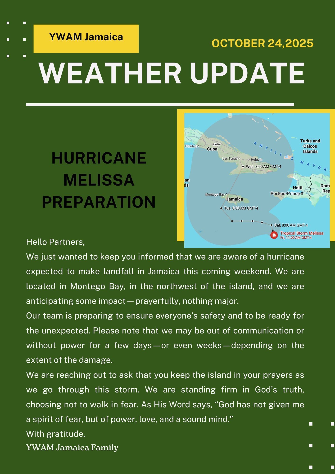 I am sending this update to ask for prayer for the island and our team! We are now preparing for a tropical storm/ hurricane to hit Jamaica. Would you please be in prayer for the hurricane to change its path, that everyone would remain safe, and we would have minimal damage. Thank you for praying with us!